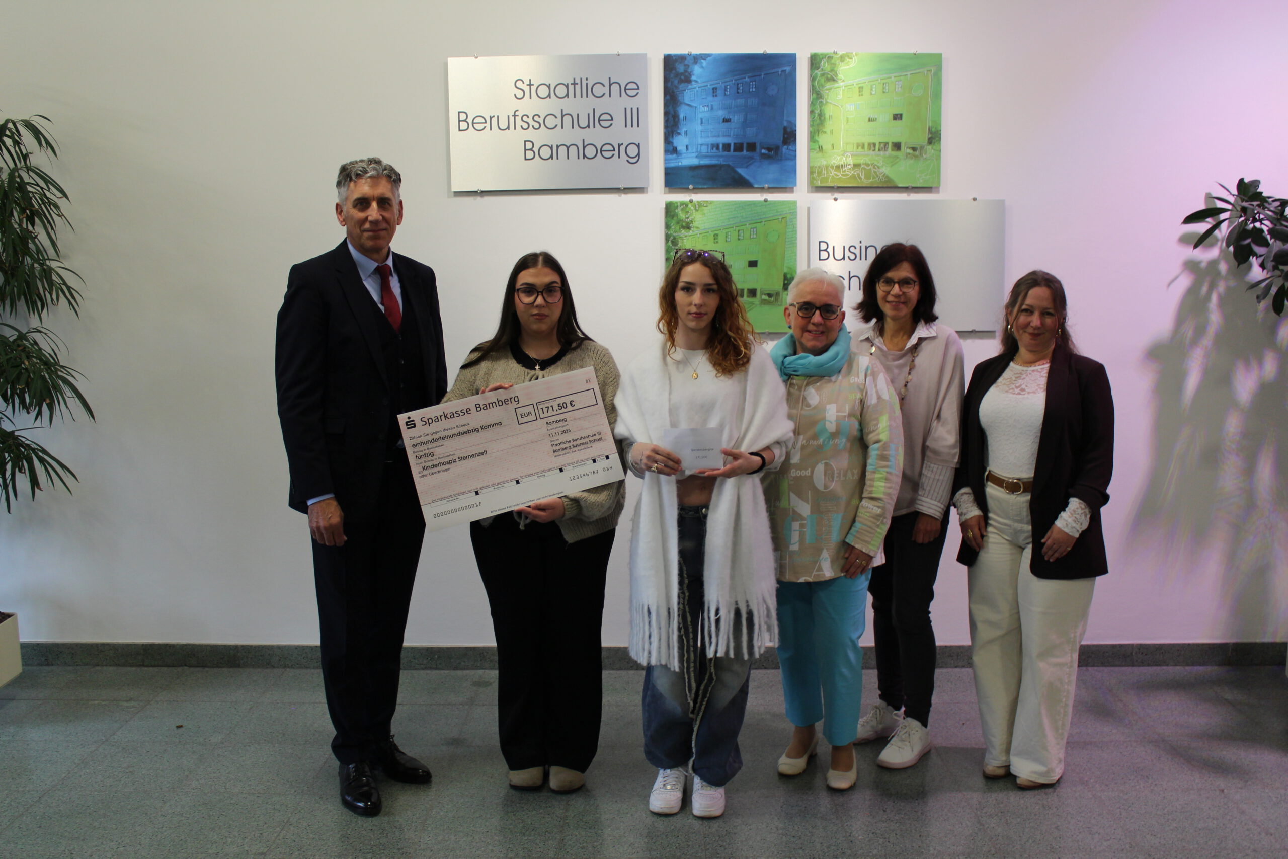 Am Vormittag des 11. November 2025 fand in der Staatlichen Berufsschule III Bamberg Business School eine feierliche Spendenübergabe von über 170 Euro an das Kinder- und Jugendhospiz Sternenzelt (Sozialstiftung Bamberg) statt. Dort erhalten Familien mit lebensverkürzend erkrankten Kindern und Jugendlichen eine wertvolle Auszeit, begleitet von einem multiprofessionellen Team.