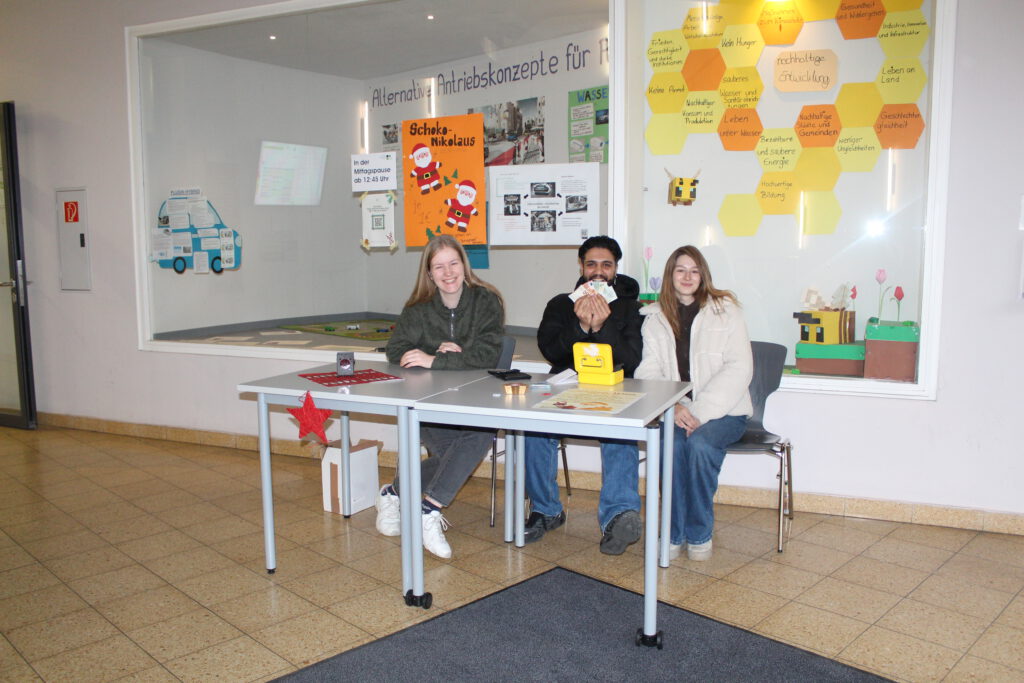 Die Aktion war ein voller Erfolg: es wurden über 290 € eingenommen! Zahlreiche Schülerinnen und Schüler nutzten die Gelegenheit, sich selbst oder ihren Freundinnen und Freunden mit kleinen Schoko-Weihnachtsmännern eine Freude zu machen und jeder Kauf half, einen wichtigen Beitrag für den guten Zweck zu leisten.